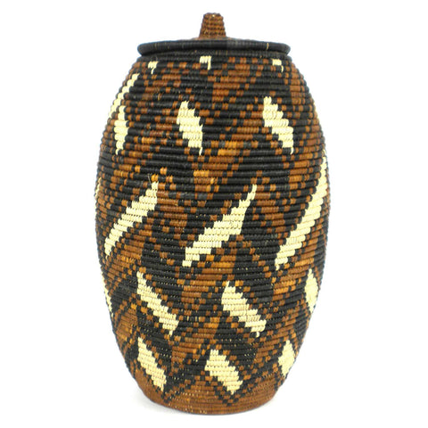 This basket is a one of a kind, you will get the basket pictured. The height is 15 inches and the circumference measures 30 inches. Each basket comes with an information card describing the meaning of the designs. This "Ukhamba" or beer basket is a bulb-shaped basket with a lid traditionally used to store the local brew. They are given as wedding gifts as the designs have specific meaning. You can research the meaning of the design from the product tag image. Handmade in South Africa by Ilala Weavers.