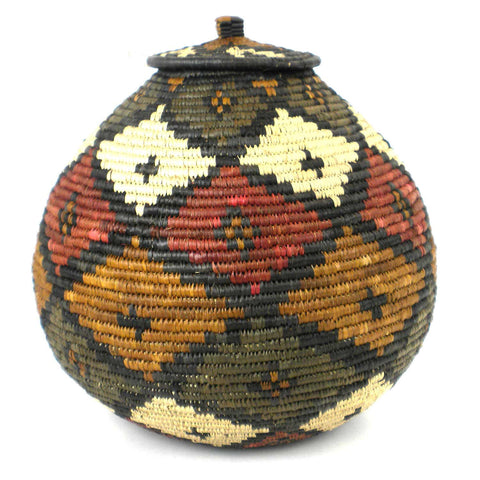 This basket is a one of a kind, you will get the basket pictured. The height is 12 inches and the circumference measures 40 inches. Each basket comes with an information card describing the meaning of the designs. This "Ukhamba" or beer basket is a bulb-shaped basket with a lid traditionally used to store the local brew. They are given as wedding gifts as the designs have specific meaning. You can research the meaning of the design from the product tag image. Handmade in South Africa by Ilala Weavers.