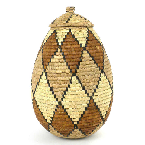 This basket is a one of a kind, you will get the basket pictured. The height is 14 inches and the circumference measures 28 inches. Each basket comes with an information card describing the meaning of the designs. This "Ukhamba" or beer basket is a bulb-shaped basket with a lid traditionally used to store the local brew. They are given as wedding gifts as the designs have specific meaning. You can research the meaning of the design from the product tag image. Handmade in South Africa by Ilala Weavers.